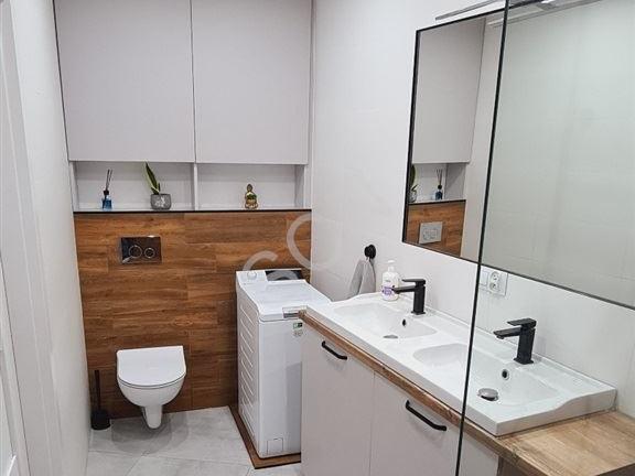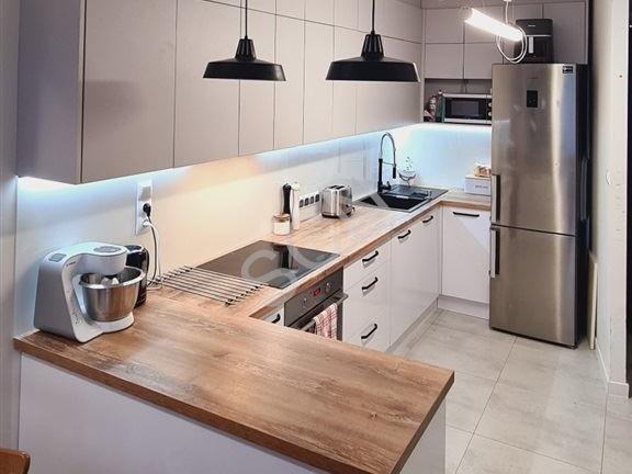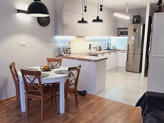 Kuchnia jest w pełni umeblowana i wyposażona w wysokiej jakości sprzęt AGD płytę indukcyjną, okap, zmywarkę, mikrofalówkę oraz lodówkę. Duże, plastikowe okna wychodzące na północny wschód doskonale doświetlają wnętrza, tworząc przytulną i ciepłą atmosferę. Stan mieszkania pozwala na natychmiastowe zamieszkanie, ewentualnie po lekkim odświeżeniu.