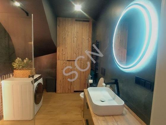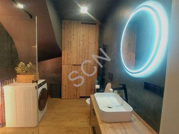 Przestronna łazienka została zaprojektowana w nowoczesnym stylu, z myślą o maksymalnej wygodzie. Znajduje się tu bardzo duża kabina prysznicowa, szafka na wymiar z umywalką, dodatkowa zabudowa z piecem gazowym oraz praktyczny schowek pod schodami. Ogrzewanie podłogowe zapewnia przyjemne ciepło i podkreśla wysoki standard wykończenia. Całość uzupełnia funkcjonalny korytarz z pojemną szafą na odzież i obuwie oraz dużym lustrem, które optycznie powiększa przestrzeń.
