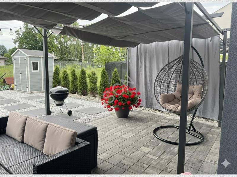 Prawdziwą perełką tej nieruchomości jest pięknie zagospodarowany ogród, stanowiący prywatną oazę spokoju. Taras z pergolą idealnie sprawdzi się podczas letnich poranków i wieczornego odpoczynku, a estetyczne wykończenie przestrzeni ozdobnymi kamieniami i płytami nadaje całości elegancki charakter. Tuje posadzone po obu stronach zapewniają intymność, a dodatkowa wiata zwiększa funkcjonalność ogrodu.